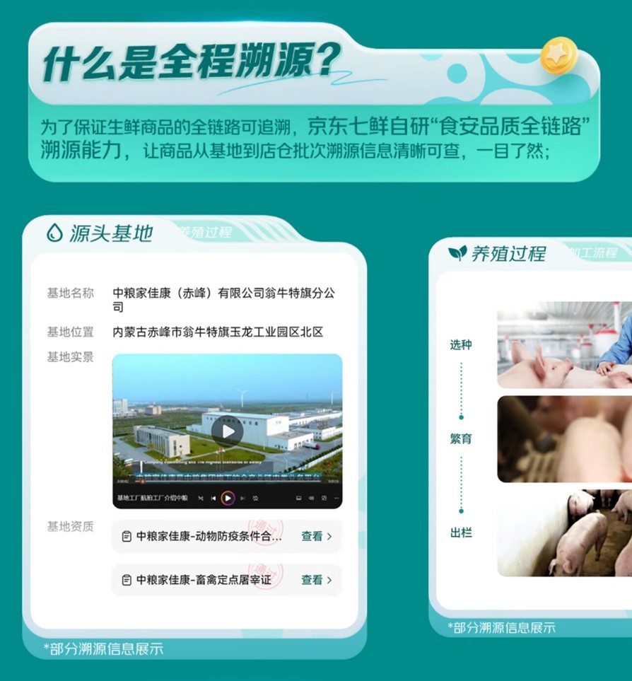 为实现生鲜商品从产地到餐桌的全流程可逃溯,京东七鲜依托数智化能力,能够实现运输体例取运输温度监测记实;该系统笼盖国度市场监视办理总局60呼吁所要求的食安巡检项目,全面笼盖休闲食物、乳品冷饮、烘焙等七大焦点类目。除了最新上线的“全程溯源”,能够逃溯到种植/养殖具体、各类天分证明、出厂检测演讲;建立了一套完整的线上化巡检管控系统。能够实现入库质检成果、检测演讲的系统化留存;并制定严苛准入法则:无人工添加剂、无转基因成分、无反式脂肪成分、无鸡精味精成分!